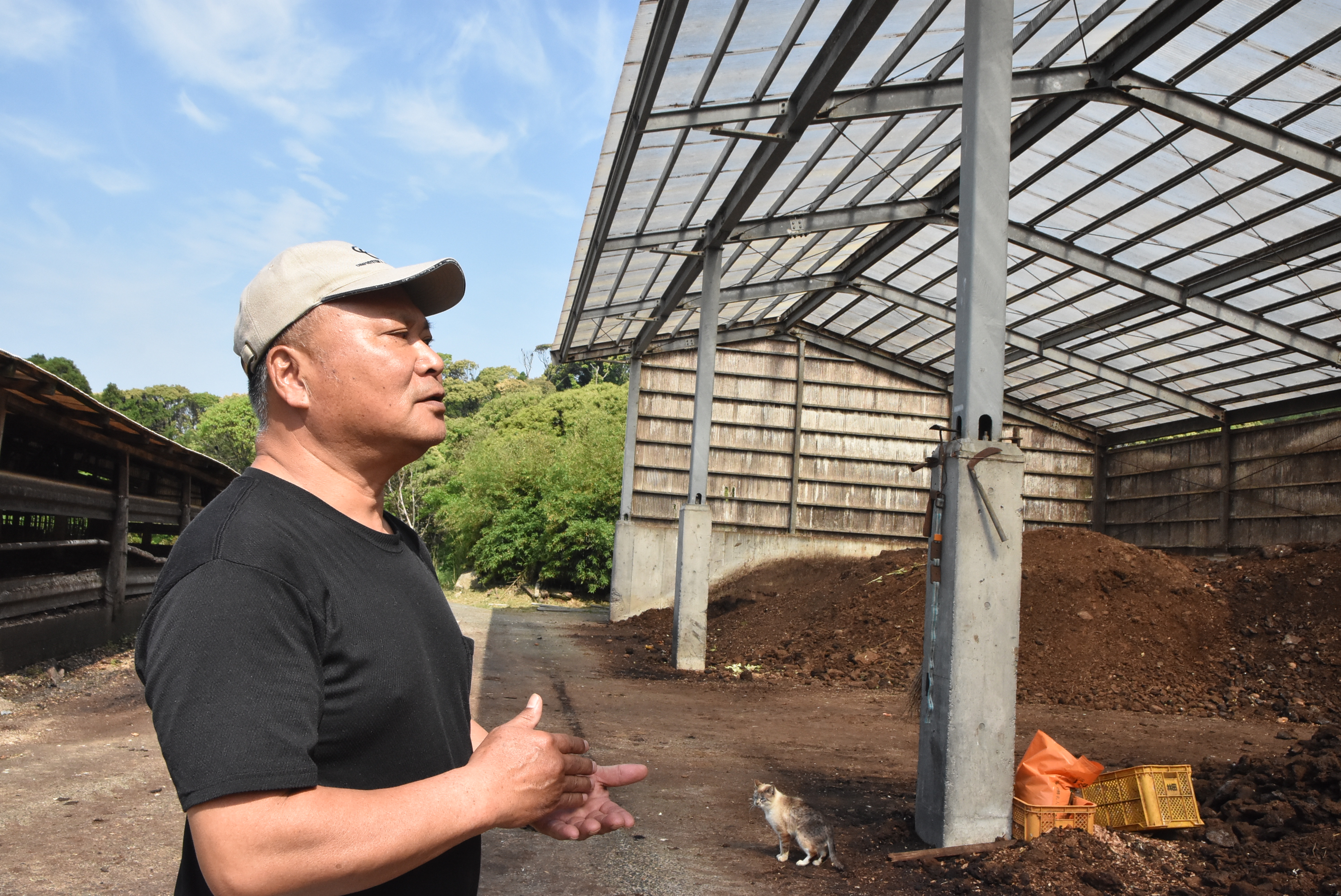 堆肥場には大量の畜ふんが置かれ、生ゴミが次々と投入されていきますが、不思議なことに悪臭や腐敗臭はなく、ハエの姿も見えません。