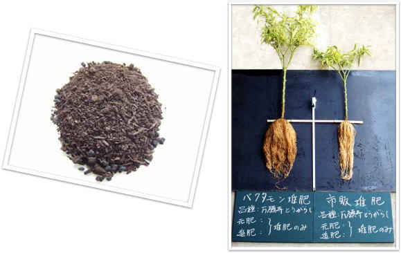 農業資材で50年の実績のある微生物資材【バクタモン】を使いやすく改良した姉妹品で、堆肥の発酵過程において人為的に作り出す事のできない分泌物(アミノ酸・ビタミンB群・酵素・核酸・有機酸など)を放出する菌の特性により、一般堆肥との比較においても、植物の生育や根量にもはっきりと違いが解ります。臭気においても窒素分を主に栄養源として繁殖する微生物ですので、臭気軽減も同時に可能となります。