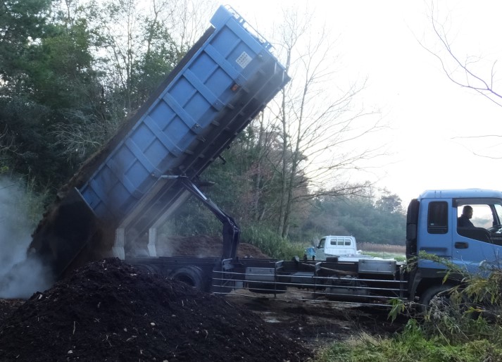 ① 11tトラックいっぱいの植木のチップを購入して、堆肥場へ運びます。