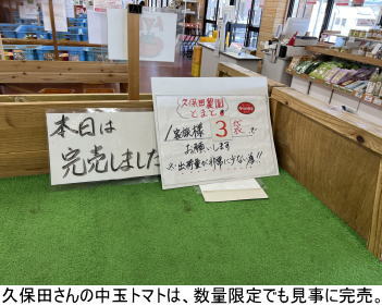 売り場は空っぽ。「本日は完売しました」のプレートが残っているだけ。さらに「久保田農園のトマトは、1家族様3袋でお願いします」という掲示もありました。しかも周囲の棚には別の農家のトマトがまだ残っていて、久保田さんのトマトの人気の高さを物語っています。
